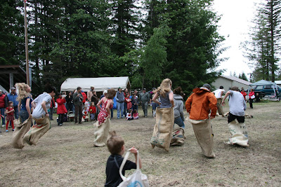 After the parade though was where the small town got to meet the city slickers. So since the 4th of July is the king of all holidays here, we decided to enjoy it. We made our presence known...no not by drinking too much or being loud, or even donating money to the community. No, we made our presence known by participating in the events held. The events such as the egg toss, pop the puffin (our given name), the sack race, and the three-legged race. Kathryn (K-Rex) had apparently packed her competitiveness and had packed enough to share with me as well.